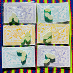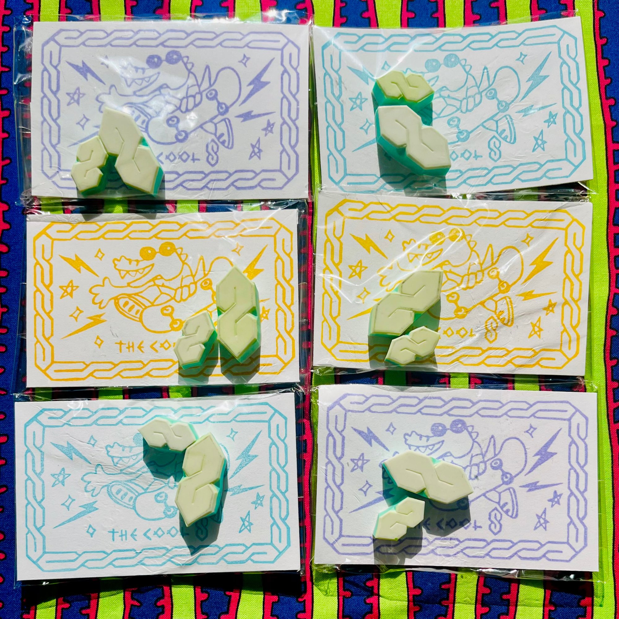 Hand carved stamp set with lino printed backing card. Put the cool s on stuff.